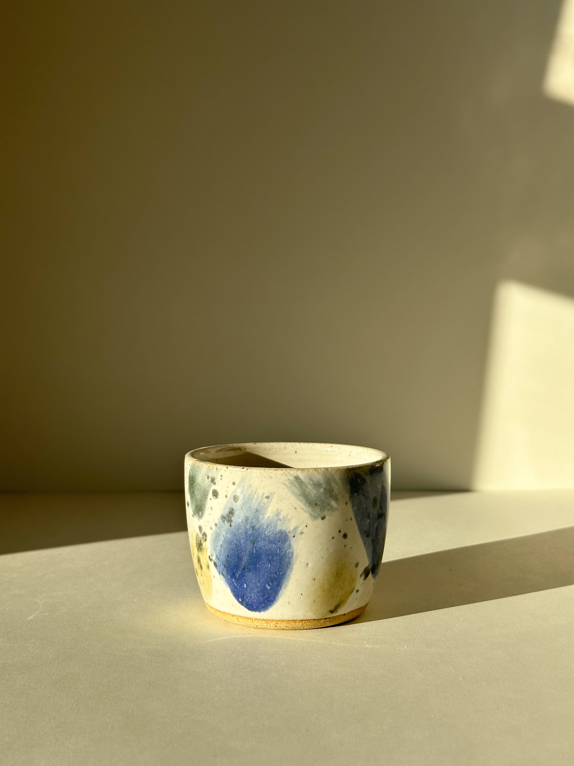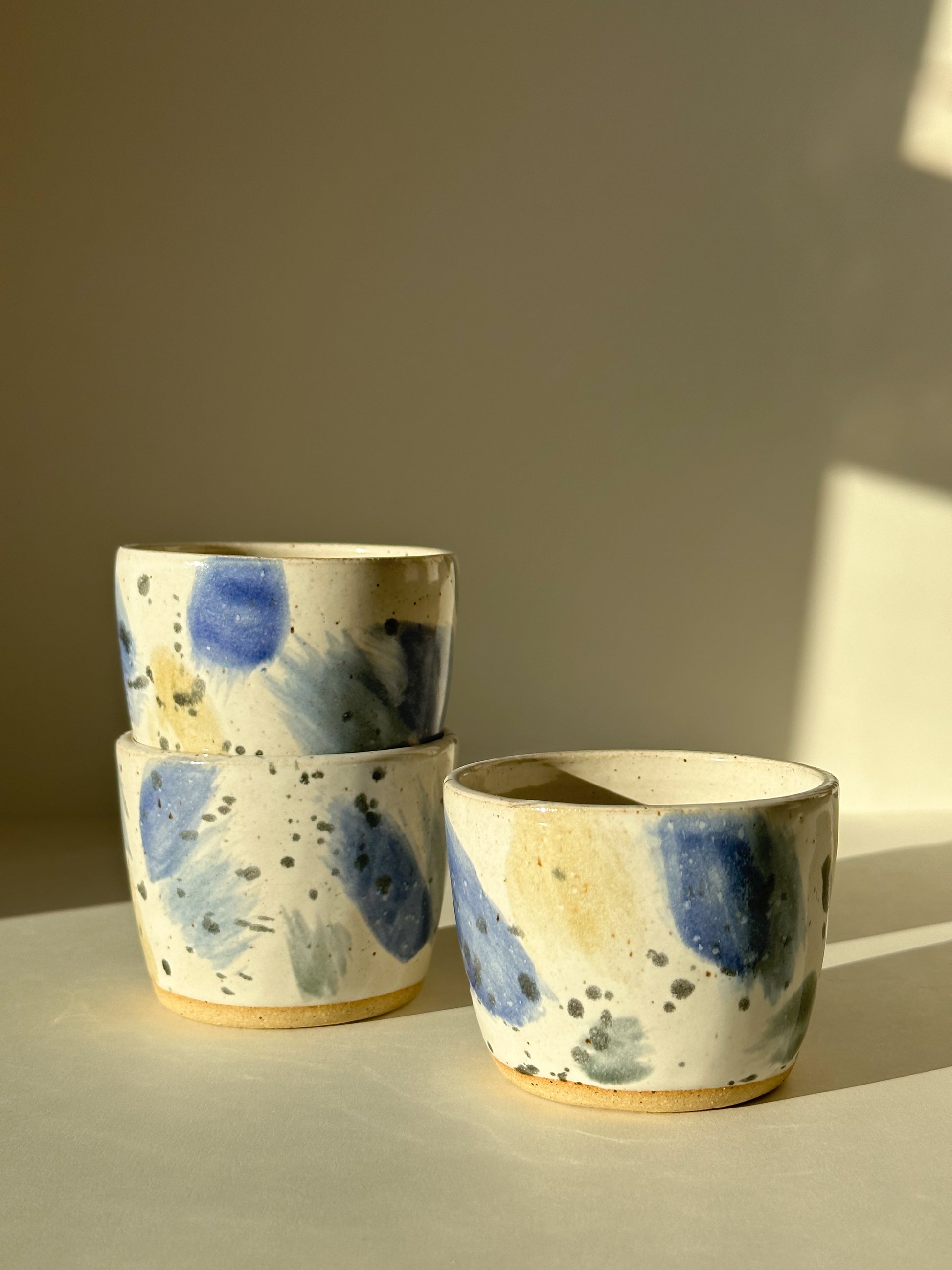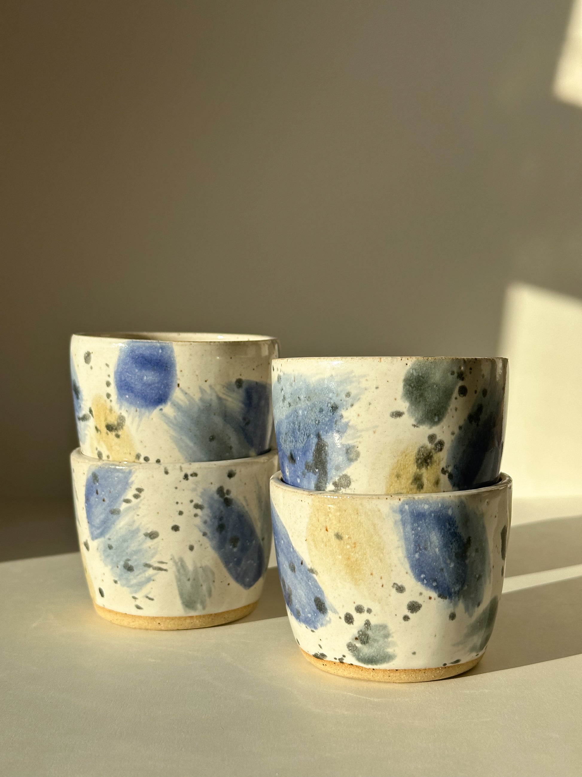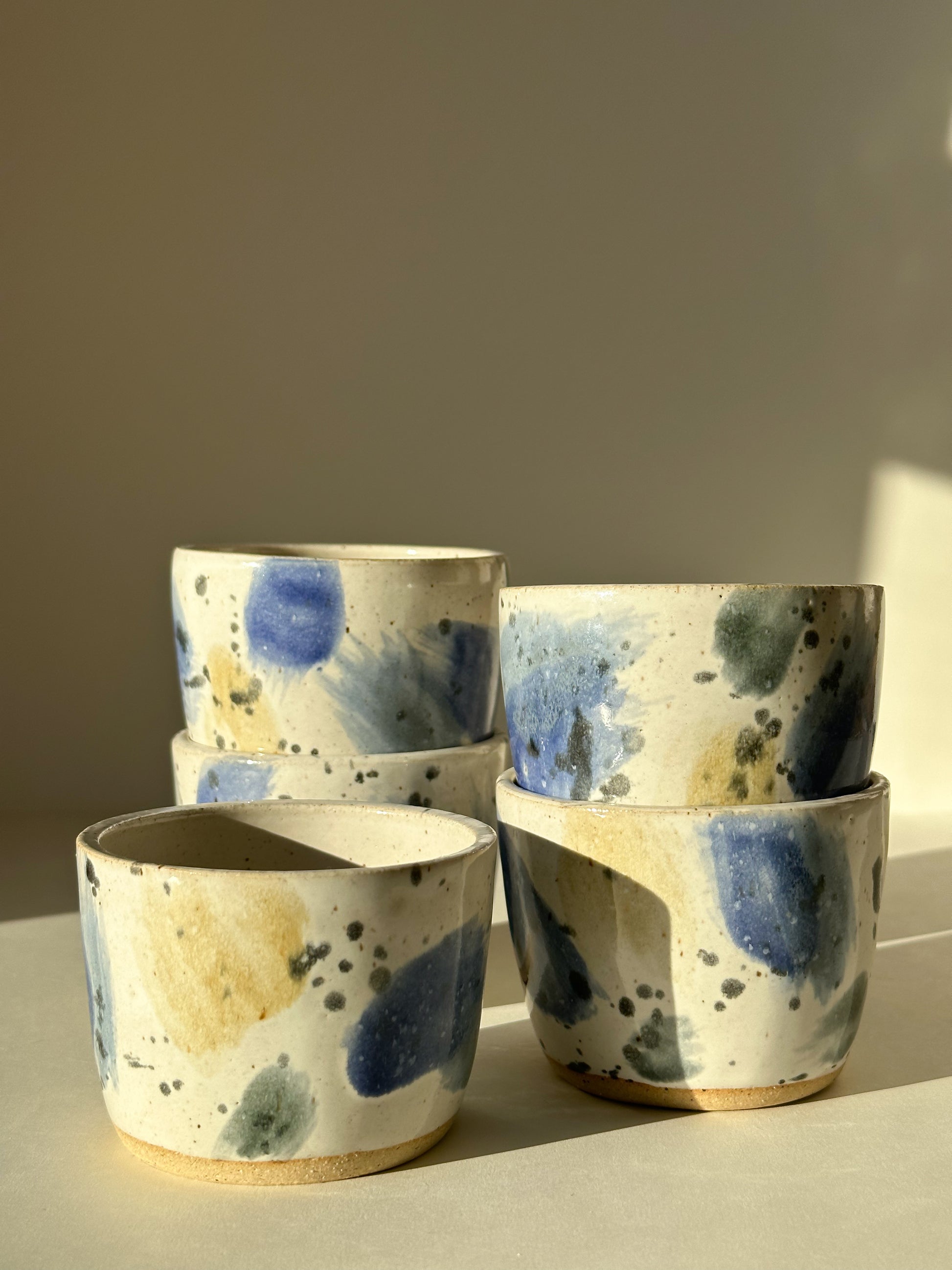 A set of 5 small hand-thrown cups with white glaze and blue, green, and yellow streaks, fired in an electric kiln, with a stoneware clay body.