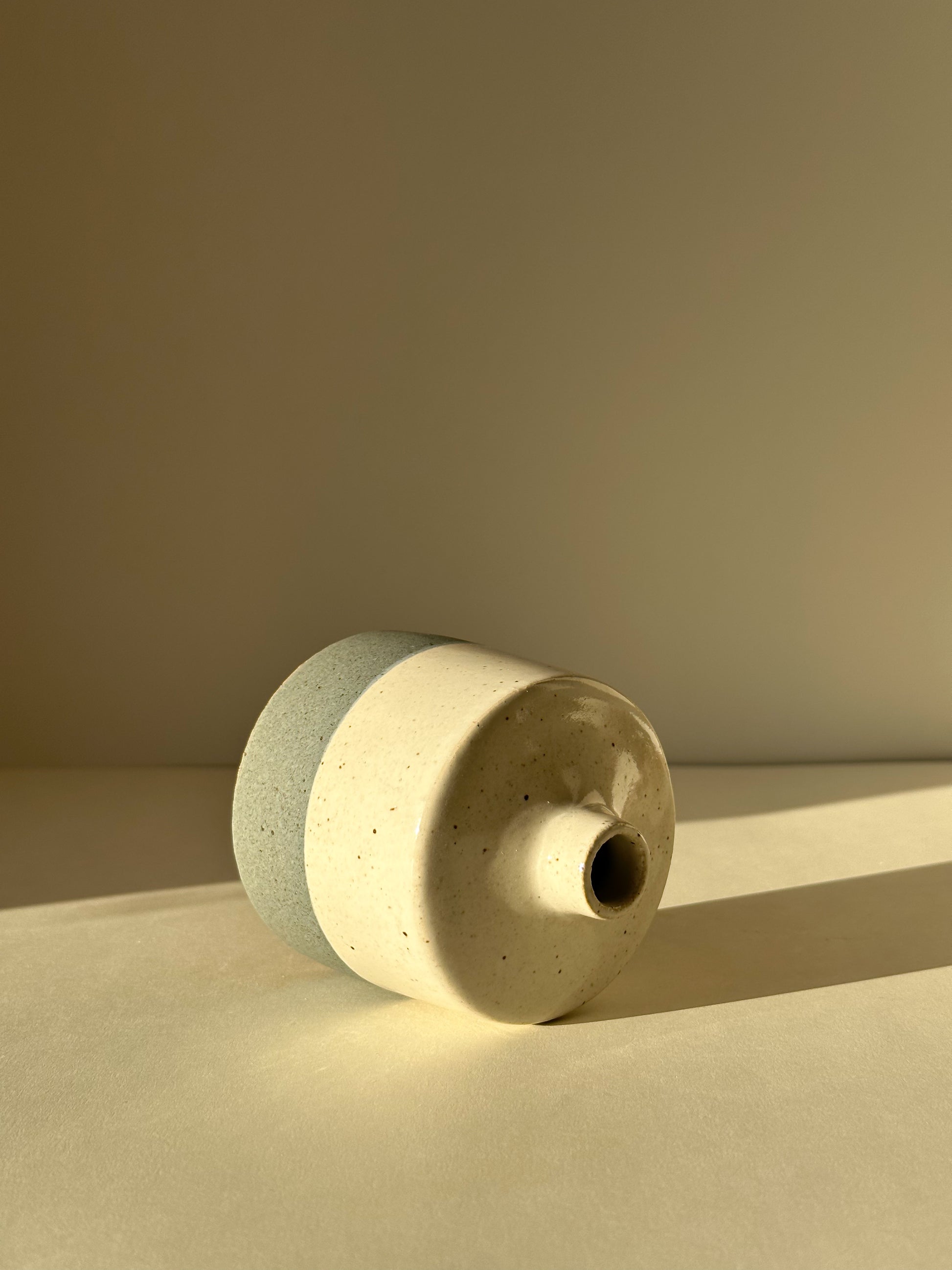 A hand-thrown bud vase with white and blue glaze, fired in an electric kiln, with a stoneware clay body.