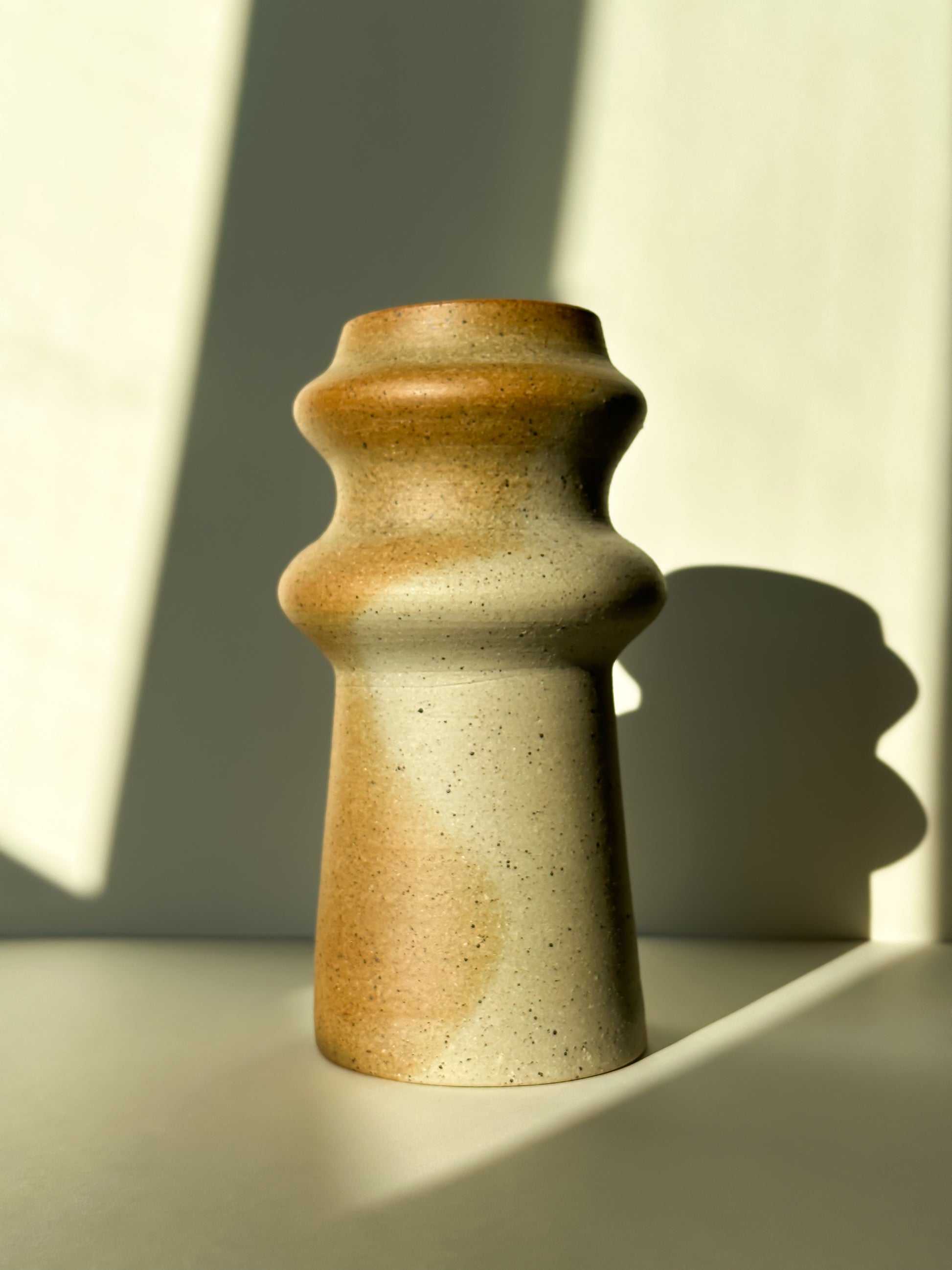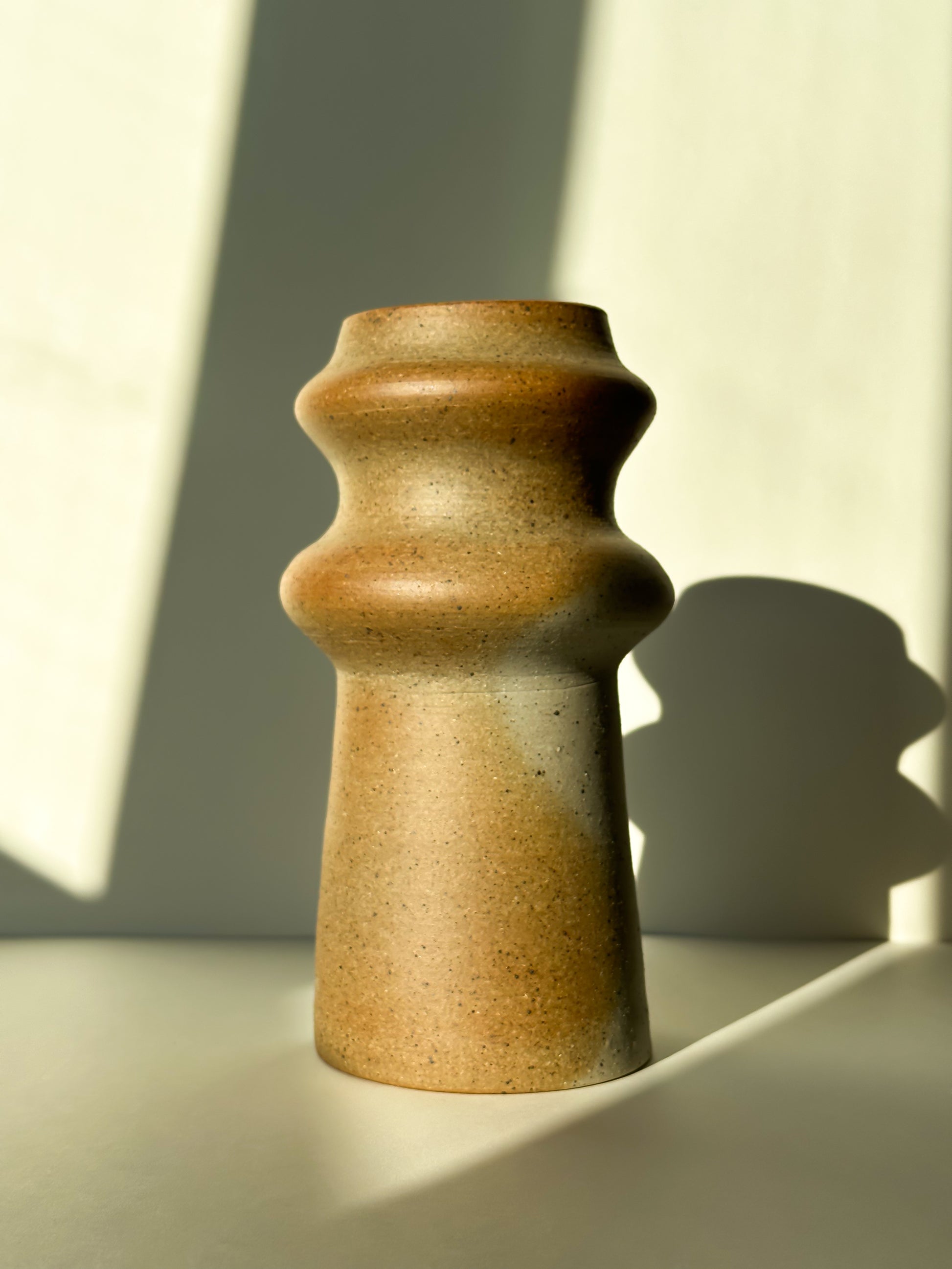 A hand-thrown vase with a brown glazed interior and un-glazed exterior, fired in a gas reduction kiln, with a stoneware clay body.